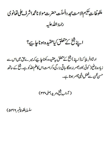 ارشاد فرمایا کہ(اپنے) شیخ کے متعلق یہ عقیدہ رکھنا چاہیے کہ میرے حق میں اس سے زیادہ نافع (کوئی) اور میسر نہ ہوگا ، باقی بزرگی و کرامت اس کا علم اللہ کو ہے۔ شیخ کے ساتھ حسن ظن سے فضل ِ الٰہی میسر ہوتا ہے۔(آداب ِ شیخ و مرید، صفحہ ۳۴۰)