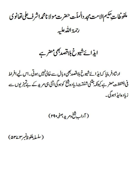 ارشاد فرمایا کہ ایذائے شیوخ بلا قصد بھی وبال سے خالی نہیں ہوتی۔اس لیے افراط فی الشفقت مضر ہے کیونکہ جتنی شفقت زیادہ شیخ کو ہوگی اتنی ہی مرید کے بے تمیزیوں سے زیادہ ایذا ہوگی۔(آداب ِ شیخ و مرید، صفحہ ۲۹۰)