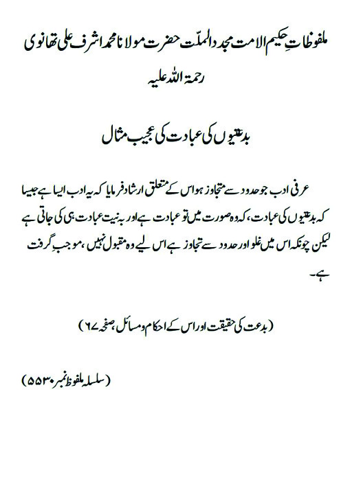 عرفی ادب جو حدود سے متجاوز ہو اس کے متعلق ارشاد فرمایا کہ یہ ادب ایسا ہے جیسا کہ بدعتیوں کی عبادت ، کہ وہ صورت میں تو عبادت ہے اور بہ نیت عبادت ہی کی جاتی ہے لیکن چونکہ اس میں غلو اور حدود سے تجاوز ہے اس لیے وہ مقبول نہیں ، موجب ِ گرفت ہے۔(بدعت کی حقیقت اور اس کے احکام و مسائل، صفحہ ۶۷)