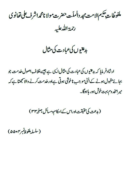 ارشاد فرمایا کہ بدعتیوں کی عبادت کی مثال ایسی ہے جیسے خلافِ اصول خدمت جو بجائے مقبول ہونے کے الٹی موجب ِ ناخوشی ہوتی ہے اور خدمت کرنے والا سمجھتا ہے کہ میرا مخدوم بہت خوش ہورہا ہوگا۔(بدعت کی حقیقت اور اس کے احکام و مسائل، صفحہ ۳۳)
