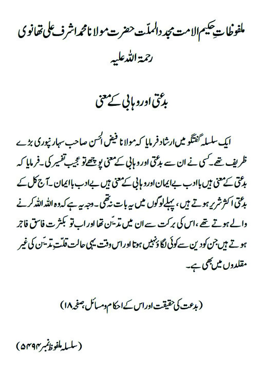 ایک سلسلہ گفتگو میںارشاد فرمایا کہ مولانا فیض الحسن صاحب سہارنپوری بڑے ظریف تھے۔ کسی نے ان سے بدعتی اور وہابی کے معنی پوچھے تو عجیب تفسیر کی۔ فرمایا کہ بدعتی کے معنی ہیں با ادب بے ایمان اور وہابی کے معنی ہیں بے ادب باایمان۔ آج کل کے بدعتی اکثر شریر ہوتے ہیں ، پہلے لوگوں میں یہ بات نہ تھی ۔ وجہ یہ ہے کہ وہ اللہ اللہ کرنے والے ہوتے تھے ، اس کی برکت سے ان میں تدیّن تھا اور اب تو بکثرت فاسق فاجر ہوتے ہیں جن کو دین سے کوئی لگاؤ نہیں ہوتا اور اس وقت یہی حالت قلّت ِ تدیّن کی غیر مقلدوں میں بھی ہے ۔(بدعت کی حقیقت اور اس کے احکام و مسائل، صفحہ ۱۸)