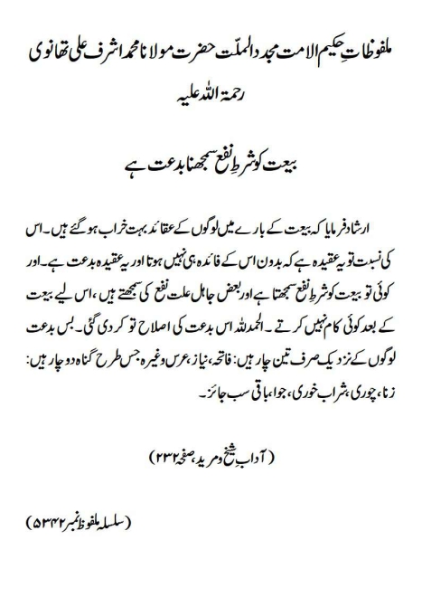 ارشاد فرمایا کہ بیعت کے بارے میں لوگوں کے عقائد بہت خراب ہو گئے ہیں ۔ اس کی نسبت تو یہ عقیدہ ہے کہ بدون اس کے فائدہ ہی نہیں ہوتا اور یہ عقیدہ بدعت ہے۔اور کوئی تو بیعت کو شرطِ نفع سمجھتا ہے اور بعض جاہل علت نفع کی سمجھتے ہیں ، اس لیے بیعت کے بعد کوئی کام نہیں کرتے ۔ الحمدللہ اس بدعت کی اصلاح تو کر دی گئی۔ بس بدعت لوگوں کے نزدیک صرف تین چار ہیں: فاتحہ، نیاز، عرس وغیرہ جس طرح گناہ دوچار ہیں: زنا، چوری، شراب خوری، جوا، باقی سب جائز۔(آداب ِ شیخ و مرید، صفحہ ۲۳۲)
