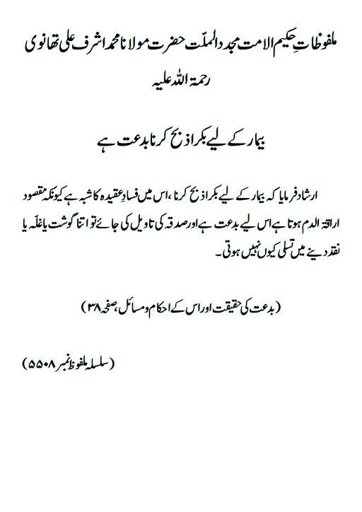 ارشاد فرمایا کہ بیمار کے لیے بکرا ذبح کرنا ، اس میں فسادِ عقیدہ کا شبہ ہے کیونکہ مقصود اراقۃ الدم (خون بہانا)ہوتا ہے اس لیے بدعت ہے اور صدقہ کی تاویل کی جائے تو اتنا گوشت یا غلّہ یا نقد دینے میں تسلی کیوں نہیں ہوتی۔(بدعت کی حقیقت اور اس کے احکام و مسائل، صفحہ ۳۸)