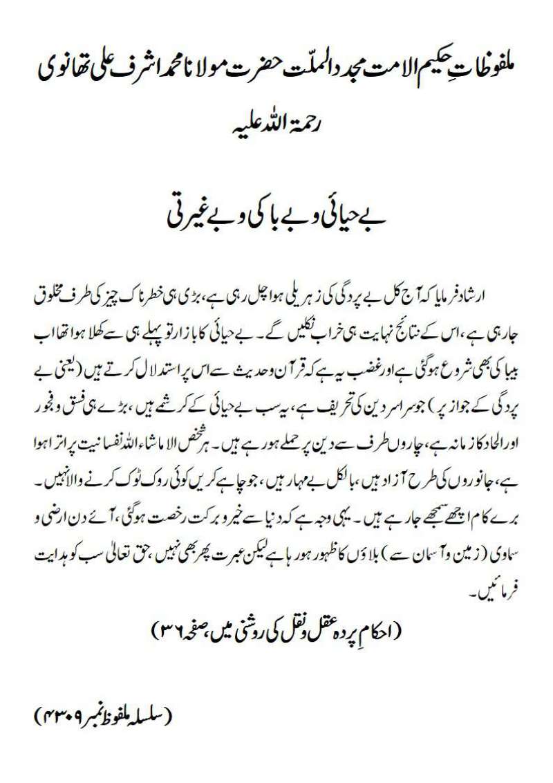 ارشاد فرمایا کہ آج کل بے پردگی کی زہریلی ہوا چل رہی ہے ، بڑی ہی خطرناک چیز کی طرف مخلوق جارہی ہے ، اس کے نتائج نہایت ہی خراب نکلیں گے ۔ بے حیائی کا بازار تو پہلے ہی سے کھلا ہوا تھا اب بیباکی بھی شروع ہوگئی ہے اور غضب یہ ہے کہ قرآن و حدیث سے اس پر استدلال کرتے ہیں (یعنی بے پردگی کے جواز پر ) جو سراسر دین کی تحریف ہے ، یہ سب بے حیائی کے کرشمے ہیں ، بڑے ہی فسق و فجور اور الحاد کا زمانہ ہے ، چاروں طرف سے دین پر حملے ہو رہے ہیں ۔ ہر شخص الاماشاء اللہ نفسانیت پر اترا ہوا ہے ، جانوروں کی طرح آزاد ہیں ، بالکل بے مہار ہیں، جو چاہے کریں کوئی روک ٹوک کرنے والا نہیں ۔ برے کام اچھے سمجھے جارہے ہیں ۔ یہی وجہ ہے کہ دنیا سے خیر و برکت رخصت ہوگئی ، آئے دن ارضی و سماوی (زمین و آسمان سے) بلاؤں کا ظہور ہورہا ہے لیکن عبرت پھر بھی نہیں ، حق تعالیٰ سب کو ہدایت فرمائیں۔(احکام ِ پردہ عقل و نقل کی روشنی میں،صفحہ۳۶)