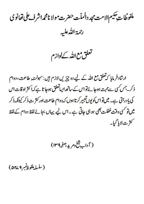 ارشاد فرمایا کہ تعلق مع اللہ کے لیے دو چیزیں لازم ہیں : سہولت ِ طاعت، دوامِ ذکر ۔ جس کسی سے محبت ہوجائے تو اس کے ساتھ ایسا تعلق ہوجاتا ہے کہ اکثر اوقات اس کی یاد رہتی ہے ۔ میں تو اس کو یوں تعبیر کرتا ہوں کہ دوامِ طاعت اور کثرتِ ذکر کیونکہ ذکر میں تو کسی وقت غفلت بھی ہو ہی جاتی ہے ۔ اس لیے یہاں بجائے لفظ دوام کے لفظ کثرت لایا گیا۔(آداب ِ شیخ و مرید، صفحہ ۱۳۹)