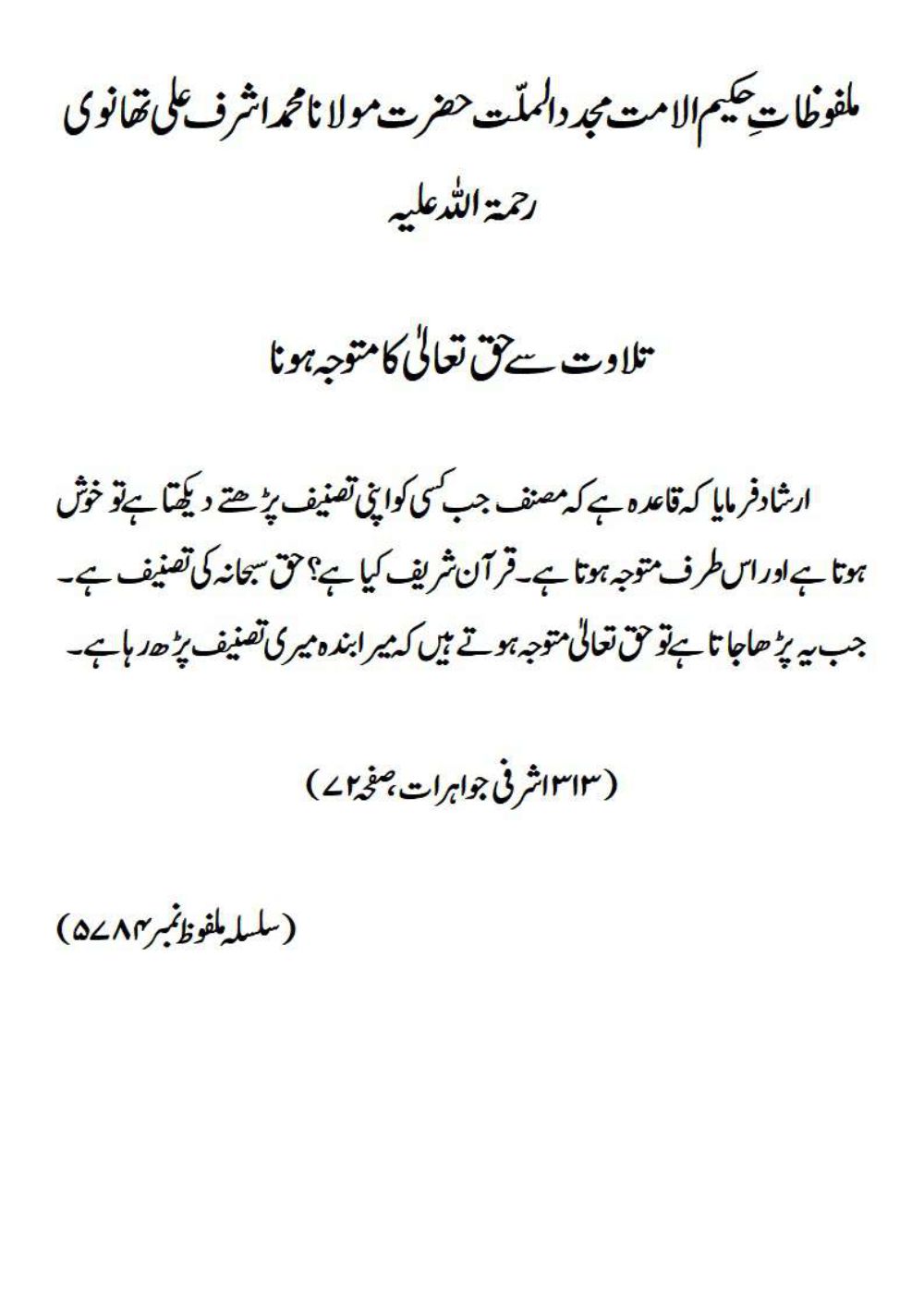 ارشاد فرمایا کہ قاعدہ ہے کہ مصنف جب کسی کو اپنی تصنیف پڑھتے دیکھتا ہے تو خوش ہوتا ہے اور اس طرف متوجہ ہوتا ہے۔ قرآن شریف کیا ہے؟ حق سبحانہ کی تصنیف ہے ۔ جب یہ پڑھا جاتا ہے تو حق تعالیٰ متوجہ ہوتے ہیں کہ میرا بندہ میری تصنیف پڑھ رہا ہے۔(۳۱۳ اشرفی جواہرات، صفحہ ۷۲)