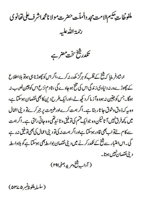 ارشاد فرمایا کہ شیخ کے قلب کو ہرگز مکدر نہ کرے ، اگر اس کو چھوڑنا ہی ہو تو بلا اطلاع کے چھوڑے ورنہ دنیاوی زندگی اس کی تلخ ہوجاوے گی ، تادمِ نزع اس کو چین نصیب نہ ہوگا ۔ جس کو یقین نہ ہو وہ آزما کر دیکھ لے ، اور ایک طرح دین کا بھی نقصان ہو سکتا ہے ، وہ یہ کہ ذوق و شوق جاتا رہتا ہے۔ اگر ہمت کرے اور طبیعت پر جبر کرے تو دینی اعمال میں کچھ فرق نہیں آتا لیکن وہ جو ایک قسم کی توفیق و تائید تھی وہ جاتی رہتی ہے۔ اگرہمت سے کام لے تو اب بھی قادر ہوسکتا ہے اور اگر ہمت نہ کی تو دینی اعمال کی بھی توفیق نہ رہے گی۔ اس اعتبار سے شیخ کے تکدر کرنے میں دینی نقصان بواسطہ بھی ہوسکتا ہے گو بلا واسطہ دینی نقصان نہیں ہوتا۔(آداب ِ شیخ و مرید، صفحہ ۲۹۱)