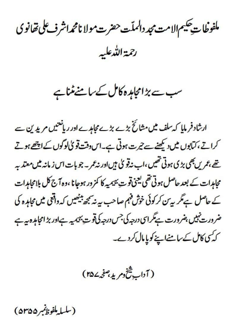 ارشاد فرمایا کہ سلف میں مشائخ بڑے بڑے مجاہدے اور ریاضتیں مریدین سے کراتے ، کتابوں میں دیکھنے سے حیرت ہوتی ہے ۔ اس وقت قویٰ لوگوں کے اچھے ہوتے تھے ، عمریں بھی بڑی ہوتی تھیں ، اب نہ قویٰ ہیںاور نہ عمر۔ جو بات اس زمانہ میں معتدبہ مجاہدات کے بعد حاصل ہوتی تھی یعنی قوتِ بہیمیہ کا کمزور ہوجانا ، وہ آج کل بلا مجاہدات کے حاصل ہے مگر یہ سن کر کوئی خوش فہم صاحب یہ نہ سمجھ بیٹھیں کہ واقعی میں مجاہدہ کی ضرورت نہیں ، ضرورت ہے مگر اسی درجہ کی جس درجہ کی قوتِ بہیمیہ ہے اور بڑا مجاہدہ یہ ہے کہ کسی کامل کے سامنے اپنے کو پامال کردے۔(آداب ِ شیخ و مرید، صفحہ ۲۵۷)