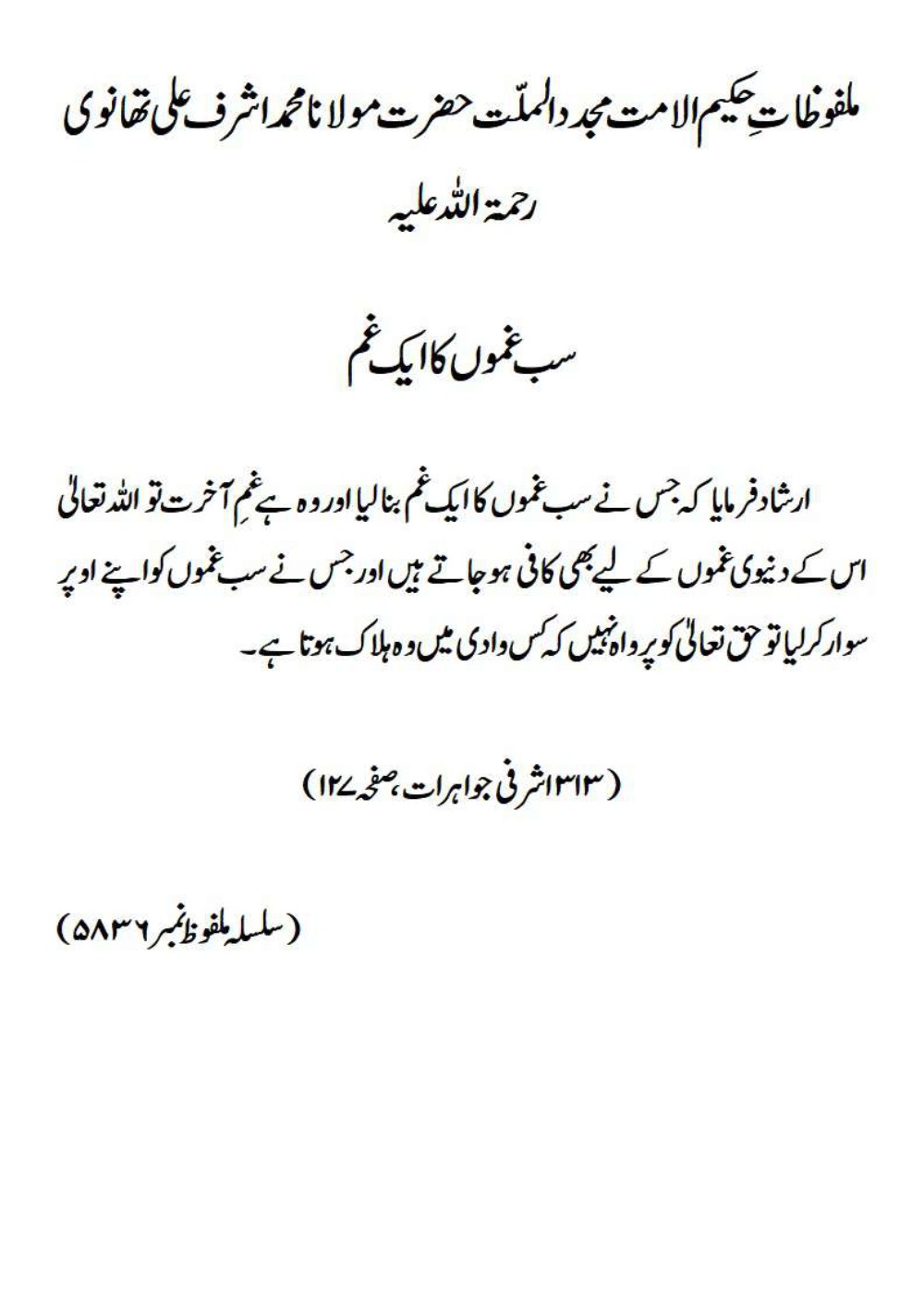 ارشاد فرمایا کہ جس نے سب غموں کا ایک غم بنا لیا اور وہ ہے غمِ آخرت تو اللہ تعالیٰ اس کے دنیوی غموں کے لیے بھی کافی ہو جاتے ہیں اور جس نے سب غموں کو اپنے اوپر سوار کر لیا تو حق تعالیٰ کو پرواہ نہیں کہ کس وادی میں وہ ہلاک ہوتا ہے۔(۳۱۳ اشرفی جواہرات، صفحہ ۱۲۷)