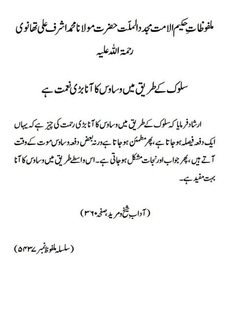 ارشاد فرمایا کہ سلوک کے طریق میں وساوس کا آنا بڑی رحمت کی چیز ہے کہ یہاں ایک دفعہ فیصلہ ہو جاتا ہے ، پھر مطمئن ہو جاتا ہے ورنہ بعض دفعہ وساوس موت کے وقت آتے ہیں ، پھر جواب اور نجات مشکل ہوجاتی ہے ۔ اس واسطے طریق میں وساوس کا آنا بہت مفید ہے۔(آداب ِ شیخ و مرید، صفحہ ۳۶۰