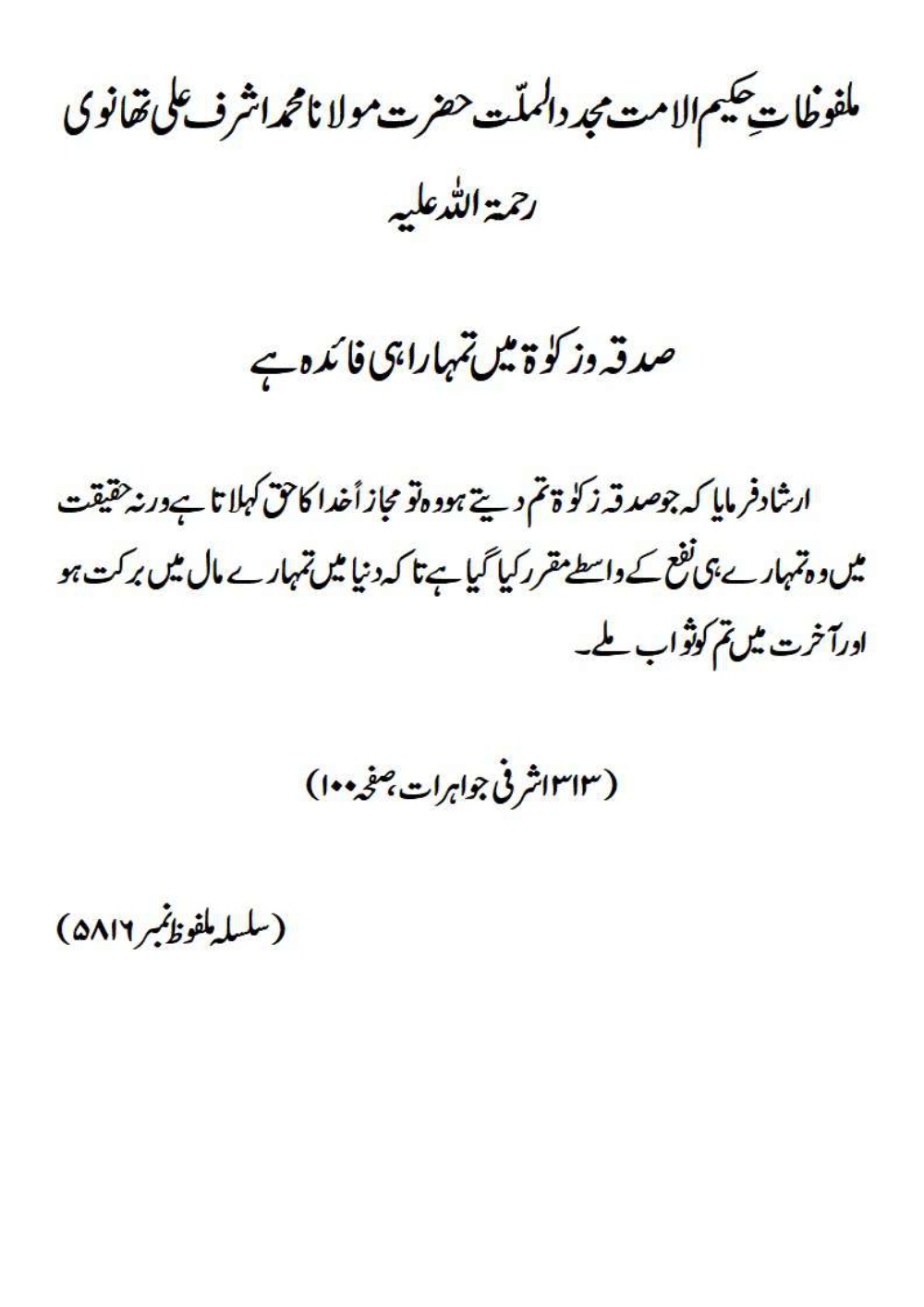 ارشاد فرمایا کہ جو صدقہ زکوٰۃ تم دیتے ہو وہ تو مجازاً خدا کا حق کہلاتا ہے ورنہ حقیقت میں وہ تمہارے ہی نفع کے واسطے مقرر کیا گیا ہے تاکہ دنیا میں تمہارے مال میں برکت ہو اور آخرت میں تم کو ثواب ملے۔(۳۱۳ اشرفی جواہرات، صفحہ ۱۰۰)