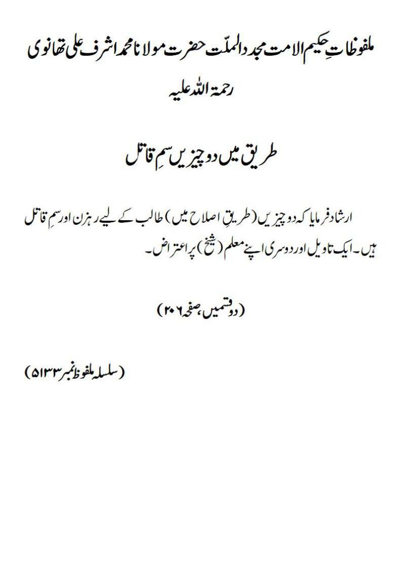 ارشاد فرمایا کہ دو چیزیں (طریقِ اصلاح میں) طالب کے لیے رہزن اور سمِ قاتل ہیں ۔ ایک تاویل اور دوسری اپنے معلم (شیخ ) پر اعتراض۔ (دو قسمیں، صفحہ ۲۰۶)