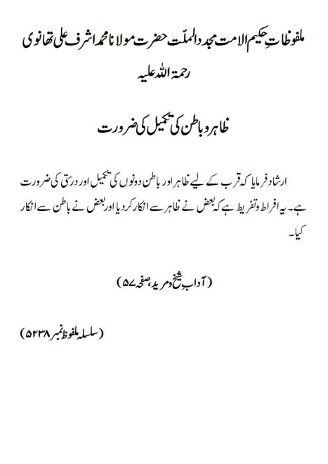 ارشاد فرمایا کہ قرب کے لیے ظاہر اور باطن دونوں کی تکمیل اور درستی کی ضرورت ہے ۔ یہ افراط و تفریط ہے کہ بعض نے ظاہر سے انکار کردیا اور بعض نے باطن سے انکار کیا۔(آداب ِ شیخ و مرید، صفحہ ۵۷)