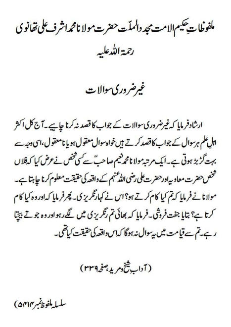 ارشاد فرمایا کہ غیرضروری سوالات کے جواب کا قصد نہ کرنا چاہیے ۔آج کل اکثر اہلِ علم ہر سوال کے جواب کا قصد کرتے ہیں خواہ سوال معقول ہو یا نا معقول، اسی وجہ سے بہت گڑبڑ ہوتی ہے ۔ ایک مرتبہ مولانا محمد نعیم صاحب ؒ سے کسی شخص نے عرض کیا کہ فلاں شخص حضرت معاویہ اور حضرت علی رضی اللہ عنہم کے واقعہ کی حقیقت معلوم کرنا چاہتا ہے۔ مولانا نے فرمایا کہ تم کیا کام کرتے ہو؟ اس نے کہا رنگریزی۔ پھر فرمایا کہ اور وہ کیا کام کرتا ہے؟ بتایا جفت فروشی۔ فرمایا کہ بھائی تم رنگریزی میں لگے رہو اور وہ جوتے بیچتا رہے ۔ تم سے قیامت میں یہ سوال نہ ہوگا کہ اس واقعہ کی حقیقت کیا تھی۔(آداب ِ شیخ و مرید، صفحہ ۳۳۹)