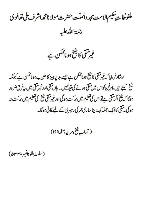 ارشاد فرمایا کہ غیر متقی کا شیخ ہونا ممکن ہے جیسے بد پرہیز کا طبیب ہونا ممکن ہے کیونکہ شیخ کہتے ہیں ماہر فن کو اس میں متقی ہونے کی قید نہیں ۔ ہاں متقی اور غیر متقی میں یہ فرق ضرور ہوگا کہ شیخ اگر متقی ہے تو اس کی تعلیم میں برکت ہوگی اور غیر متقی شیخ کی تعلیم میں برکت نہ ہوگی ۔ متقی کا ایک جملہ کہہ دینا ساری عمر کی رہبری کے لیے کافی ہوگا۔(آداب ِ شیخ و مرید، صفحہ ۱۹۹)