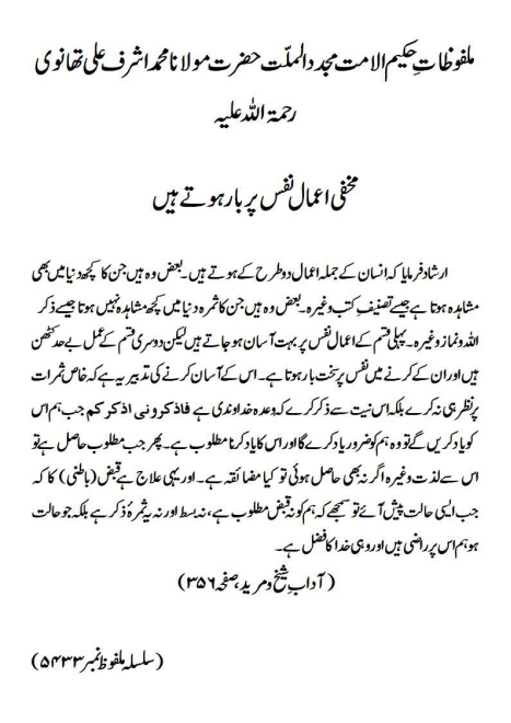 ارشاد فرمایا کہ انسان کے جملہ اعمال دو طرح کے ہوتے ہیں ۔ بعض وہ ہیں جن کا کچھ دنیا میں بھی مشاہدہ ہوتا ہے جیسے تصنیف ِ کتب وغیرہ۔ بعض وہ ہیں جن کا ثمرہ دنیا میں کچھ مشاہدہ نہیں ہوتا جیسے ذکر اللہ و نماز وغیرہ۔ پہلی قسم کے اعمال نفس پر بہت آسان ہو جاتے ہیں لیکن دوسری قسم کے عمل بے حد کٹھن ہیں اور ان کے کرنے میں نفس پر سخت بار ہوتا ہے ۔ اس کے آسان کرنے کی تدبیر یہ ہے کہ خاص ثمرات پر نظر ہی نہ کرے بلکہ اس نیت سے ذکر کرے کہ وعدہ خداوندی ہے فاذکرونی اذکرکم جب ہم اس کو یاد کریں گے تو وہ ہم کو ضرور یادکرے گا اور اس کا یاد کرنا مطلوب ہے۔ پھر جب مطلوب حاصل ہے تو اس سے لذت وغیرہ اگر نہ بھی حاصل ہوئی تو کیا مضائقہ ہے ۔ اور یہی علاج ہے قبض(باطنی) کا کہ جب ایسی حالت پیش آئے تو سمجھے کہ ہم کو نہ قبض مطلوب ہے ، نہ بسط اور نہ یہ ثمرہ ٔ ذکر ہے بلکہ جو حالت ہو ہم اس پر راضی ہیں اور وہی خدا کا فضل ہے۔(آداب ِ شیخ و مرید، صفحہ ۳۵۶)