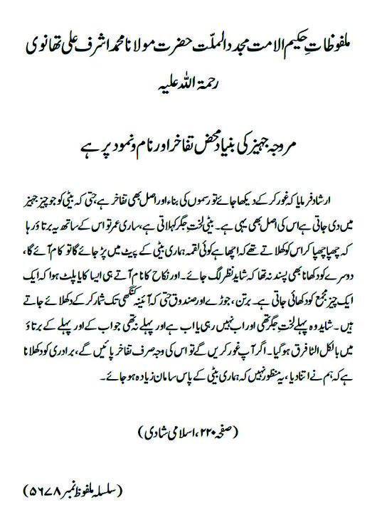 ارشاد فرمایا کہ غور کر کے دیکھا جائے تو رسموںکی بناء اور اصل بھی تفاخر ہے ، حتی کہ بیٹی کو جو چیز جہیز میں دی جاتی ہے اس کی اصل بھی یہی ہے ۔ بیٹی لخت ِ جگر کہلاتی ہے، ساری عمر تو اس کے ساتھ یہ برتاؤ رہا کہ چھپا چھپا کر اس کو کھلاتے تھے کہ اچھا ہے کوئی لقمہ ہماری بیٹی کے پیٹ میں پڑ جائے گا تو کام آئے گا ، دوسرے کو دکھانا بھی پسند نہ تھا کہ شاید نظر لگ جائے ۔اور نکاح کا نام آتے ہی ایسا کایا پلٹ ہوا کہ ایک ایک چیز مجمع کو دکھائی جاتی ہے۔ برتن ، جوڑے اور صندوق حتی کہ آئینہ کنگھی تک شمار کر کے دکھلائے جاتے ہیں ۔ شاید وہ پہلے لخت ِ جگر تھی اور اب نہیں رہی یا اب ہے اور پہلے نہ تھی جو اب کے اور پہلے کے برتاؤ میں بالکل الٹا فرق ہوگیا ۔ اگر آپ غور کریں گے تو اس کی وجہ صرف تفاخر پائیں گے ، برادری کو دکھلانا ہے کہ ہم نے اتنا دیا ، یہ منظور نہیں کہ ہماری بیٹی کے پاس سامان زیادہ ہوجائے۔(صفحہ ۲۲۰،اسلامی شادی)