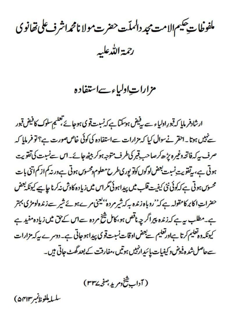 ارشاد فرمایا کہ قبورِ اولیاء سے یہ فیض ہو سکتا ہے کہ نسبت قوی ہوجائے ، تعلیمِ سلوک کا فیض قبور سے نہیں ہوتا ۔ احقر نے سوال کیا کہ مزارات سے استفادہ کی کوئی خاص صورت ہے ؟ تو فرمایا کہ صرف یہ کہ فاتحہ وغیرہ پڑھ کر صاحب ِ قبر کی طرف متوجہ ہو کر بیٹھ جائے۔ اس سے نسبت کی تقویت ہوتی ہے ، یہ تقویت ِ نسبت بعض لوگوں کو تو پوری طرح معلوم و محسوس ہوتی ہے ورنہ کم از کم اتنی بات محسوس ہوتی ہے کہ کوئی نئی کیفیت قلب میں پیدا ہوئی مگر اس میں زیادہ کاوش نہ کرنا چاہیے کیونکہ بعض حضراتِ اکابر کا مقولہ ہے کہ ’’روباہ زندہ بہ کہ شیر مردہ‘‘ یعنی مرے ہوئے شیر سے زندہ لومڑی بہتر ہے۔ مطلب یہ ہے کہ زندہ پیر اگرچہ ناقص ہو، کامل شیخ ِمردہ سے اس کے حق میں زیادہ مفید ہے کیونکہ وہ تعلیم کرتا ہے اور تعلیم سے بعض اوقات نسبت قوی پیدا ہوجاتی ہے ۔ دوسرے یہ کہ مزارات سے حاصل شدہ فیوض و کیفیات پائیدار نہیں ہوتیں، مفارقت کے بعد گھٹ جاتی ہیں ۔(آداب ِ شیخ و مرید، صفحہ ۳۳۷)