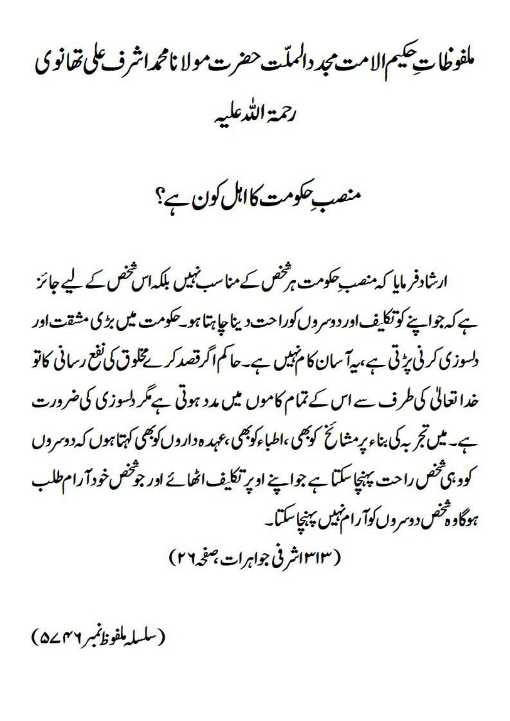 ارشاد فرمایا کہ منصب ِ حکومت ہر شخص کے مناسب نہیں بلکہ اس شخص کے لیے جائز ہے کہ جو اپنے کو تکلیف اور دوسروں کو راحت دینا چاہتا ہو۔ حکومت میں بڑی مشقت اور دلسوزی کرنی پڑتی ہے، یہ آسان کام نہیں ہے۔ حاکم اگر قصد کرے مخلوق کی نفع رسانی کا تو خدا تعالیٰ کی طرف سے اس کے تمام کاموں میں مدد ہوتی ہے مگر دلسوزی کی ضرورت ہے۔ میں تجربہ کی بناء پر مشائخ کو بھی ، اطباء کو بھی، عہدہ داروں کو بھی کہتا ہوں کہ دوسروں کو وہی شخص راحت پہنچا سکتا ہے جو اپنے اوپر تکلیف اٹھائے اور جو شخص خود آرام طلب ہوگا وہ شخص دوسروں کو آرام نہیں پہنچا سکتا۔(۳۱۳ اشرفی جواہرات، صفحہ ۲۶)