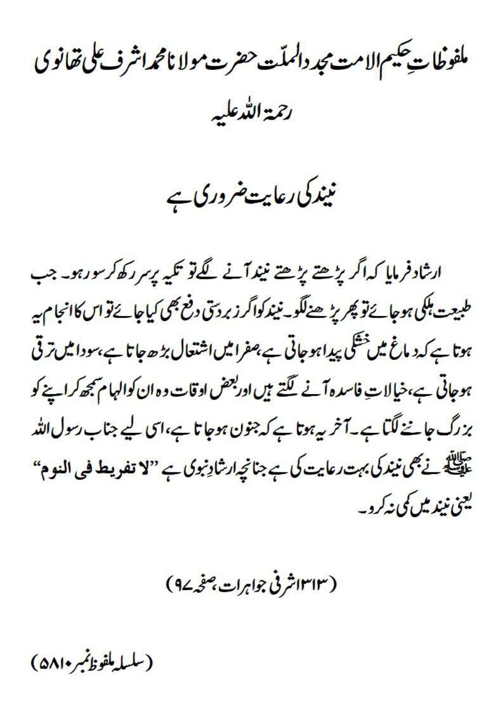 ارشاد فرمایا کہ اگر پڑھتے پڑھتے نیند آنے لگے تو تکیہ پرسر رکھ کر سو رہو۔ جب طبیعت ہلکی ہوجائے تو پھر پڑھنے لگو ۔ نیند کو اگر زبردستی دفع بھی کیا جائے تو اس کا انجام یہ ہوتا ہے کہ دماغ میں خشکی پیدا ہو جاتی ہے ، صفرا میں اشتعال بڑھ جاتا ہے ، سودا میں ترقی ہوجاتی ہے، خیالاتِ فاسدہ آنے لگتے ہیں اور بعض اوقات وہ ان کو الہام سمجھ کر اپنے کو بزرگ جاننے لگتا ہے ۔ آخر یہ ہوتا ہے کہ جنون ہوجاتا ہے، اسی لیے جناب رسول اللہ ﷺ نے بھی نیند کی بہت رعایت کی ہے جنانچہ ارشادِ نبوی ہے ’’لا تفریط فی النوم‘‘ یعنی نیند میں کمی نہ کرو۔(۳۱۳ اشرفی جواہرات، صفحہ ۹۷)