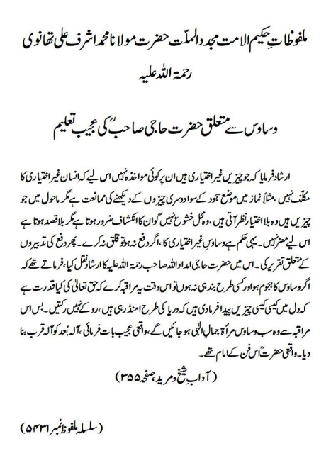 ارشاد فرمایا کہ جو چیزیں غیر اختیاری ہیں ان پر کوئی مواخذہ نہیں اس لیے کہ انسان غیر اختیاری کا مکلف نہیں ، مثلاً نماز میں موضع سجود کے سوا دوسری چیزوں کے دیکھنے کی ممانعت ہے مگر ماحول میں جو چیزیں ہیں وہ بلا اختیار نظر آتی ہیں ، وہ محل خشوع نہیں گو ان کا انکشاف ضرور ہوتا ہے مگر بلا قصد ہوتا ہے اس لیے مضر نہیں۔ یہی حکم ہے وساوسِ غیر اختیاری کا ، اگر دفع نہ ہوتو قلق نہ کرے ۔ پھر دفع کی تدبیروں کے متعلق تقریر کی ۔ اس میں حضرت حاجی امداد اللہ صاحب رحمۃ اللہ علیہ کا ارشاد نقل کیا، فرماتے تھے کہ اگر وساوس کا ہجوم ہو اور کسی طرح بند ہی نہ ہوں تو اس وقت یہ مراقبہ کرے کہ حق تعالیٰ کی کیا قدرت ہے کہ دل میں کیسی کیسی چیزیں پیدا فرمادی ہیں کہ دریا کی طرح امنڈ رہی ہیں ، روکے نہیں رکتیں ۔ بس اس مراقبہ سے وہ سب وساوس مرأۃ جمالِ الٰہی ہو جائیں گے ، واقعی عجیب بات فرمائی ، آلہ بُعد کو آلہ قرب بنا دیا۔واقعی حضرتؒ اس فن کے امام تھے۔ (آداب ِ شیخ و مرید، صفحہ ۳۵۵)