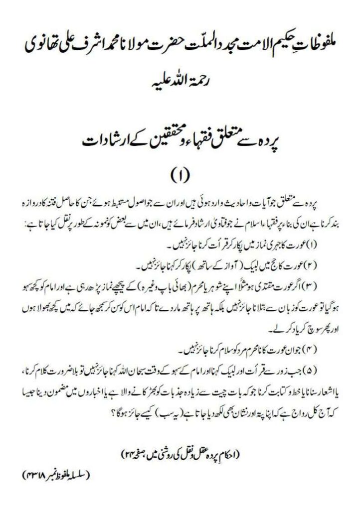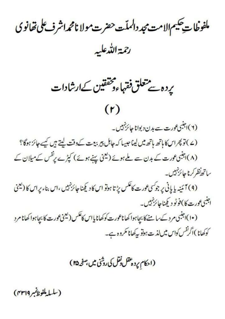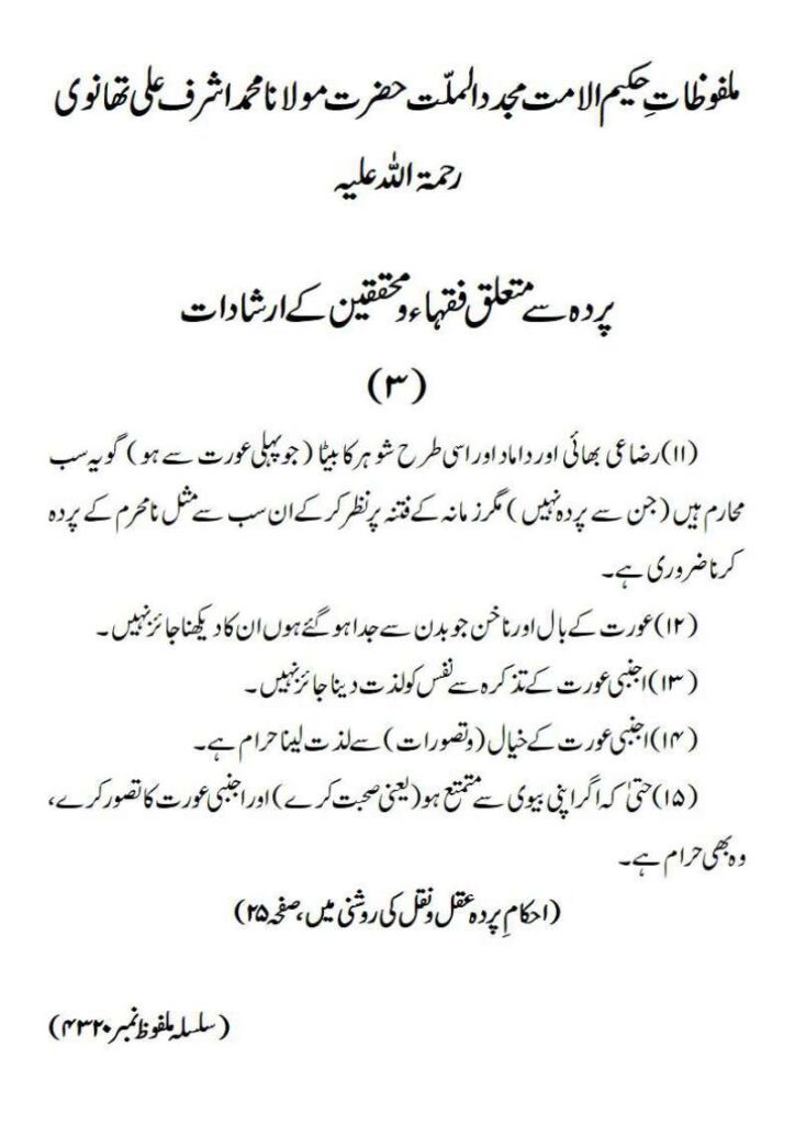 حکیم الامت حضرت مولانا اشرف علی تھانوی رحمہ اللہ تعالیٰ کے یہ ملفوظات احکام پردہ کے متعلق ہیں ۔ ۔ خود بھی پڑھیں اور دوستوں سے بھی شئیر کریں ۔