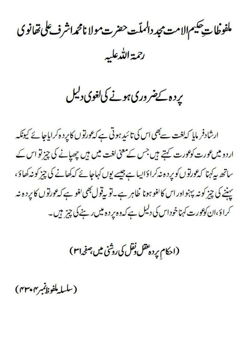ارشاد فرمایا کہ پردہ کے متعلق ایک موٹی سی بات یہ ہے کہ خدا تعالیٰ نے جن کو مجنوں(پاگل) بنایا ہے ، ان کو آپ خود قید کردیتے ہیں (ہاتھ پیر تک باندھ دیتے ہیں) ۔ اس سے معلوم ہوا کہ نقصِ عقل موجب ِ قید ہے (یعنی عقل کم ہونے کا تقاضا یہ ہے کہ اس کو قید میں رکھا جائے) ۔ جب یہ بات مسلّم ہوگئی تو عورتوں کے لئے بھی اسی وجہ سے قید (پردہ)کی ضرورت ہے کیونکہ ان کا ناقص العقل ہونا (کم عقل ہونا) مسلّم(طے شدہ) ہے ۔ ہاں یہ فرق ضرور ہونا چاہئے کہ جیسا نقص (کمی) ہو ویسی ہی قید ہو ۔ مجنون کامل کے لئے قید بھی کامل ہوتی ہے کہ ایک کوٹھری میں بند کر دیتے ہیں ، ہاتھ پیر باندھ دیتے ہیں اور مجنون ناقص (یعنی عورت) کے لئے قید ناقص ہونا چاہئے کہ اس کو بلا اجازت گھر سے نکلنے کا اختیار نہ دیا جائے۔ (احکام ِ پردہ عقل و نقل کی روشنی میں،صفحہ ۳۲)